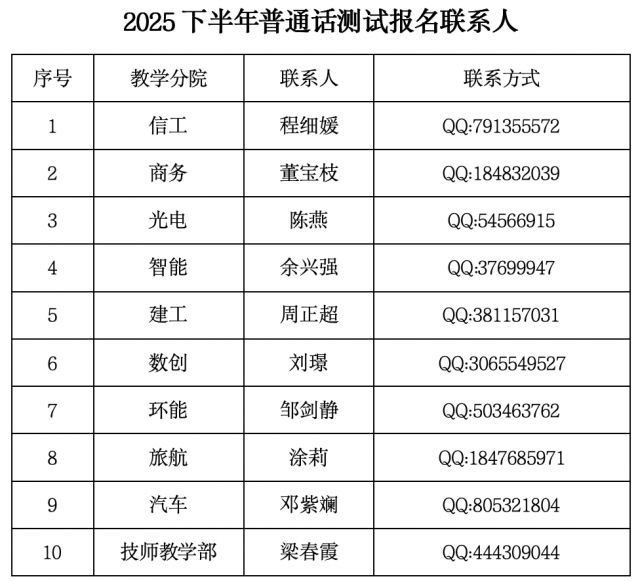 各教學(xué)分院教務(wù)科指定專人(見(jiàn)下表)組織開(kāi)展該項(xiàng)工作,組織在校師生填寫(附件1),并于9月25日前將報(bào)名表(電子稿和紙質(zhì)稿)交普通話測(cè)試站(行政樓205)。
